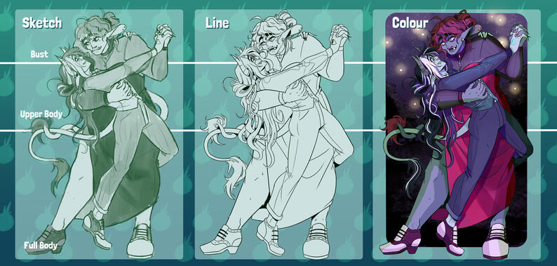 • A bust commission is defined as a drawing of the character(s) cut off at the collar bone, including hands if requested.• An upper body commission is defined as a drawing of the character(s) that cuts off at the pelvis.• A full body commission is defined as a drawing that shows the entirity of the character.• A simple background is defined as a flat colour, gradient or simple pattern. Can include basic skies and one prop (eg. a chair)• A detailed background is defined as a scene in which I have had to use perspective to create a complex environment. It will include a foreground, background and midground to create depth of field.• An emote is defined as a smaller, more simple drawing with the purpose to be used in chats such as twitch or discord.